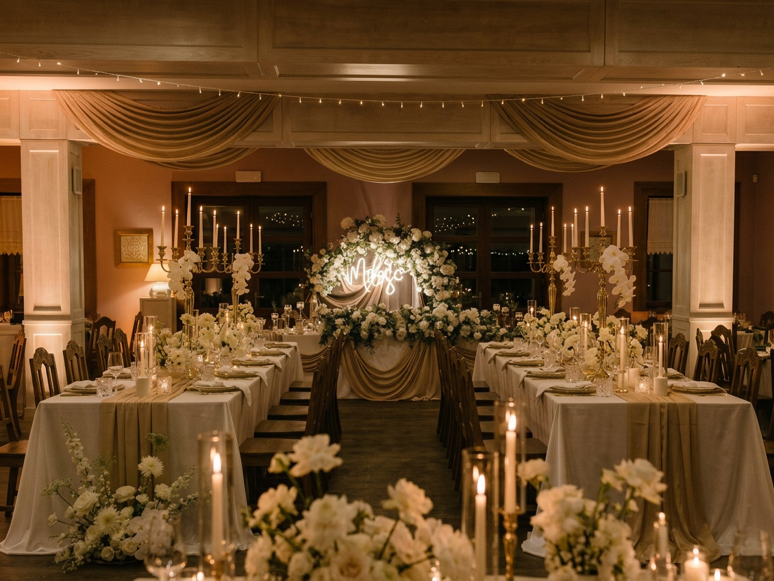 Stylowe wnętrza zabytkowej restauracji, idealne na eleganckie przyjęcia weselne.