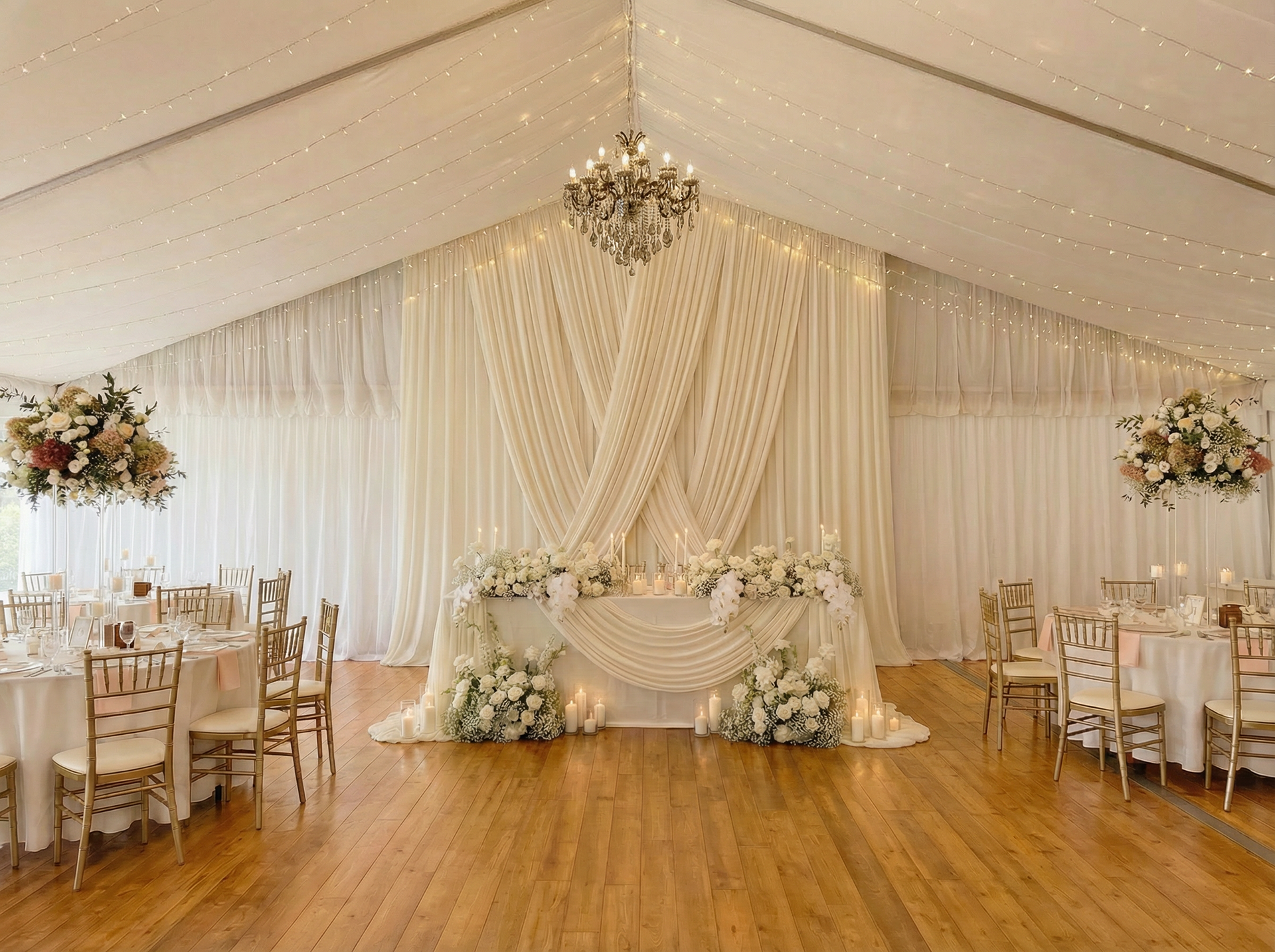 Dzięki neutralnej, jasnej konstrukcji namiot stanowi doskonałą bazę dla każdej koncepcji dekoracyjnej - od eleganckich przyjęć glamour po naturalne realizacje w stylu boho, garden party czy minimalistyczne slow wedding.