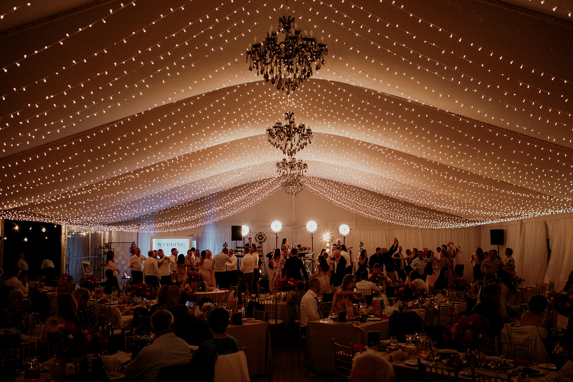 Konstrukcja namiotu została zaprojektowana tak, aby zapewnić pełen komfort nawet przy dużej liczbie gości. Jasne, wysokie wnętrze daje poczucie przestrzeni i lekkości, a możliwość otwierania ścian bocznych pozwala połączyć zadaszoną strefę z plenerem. Dzięki temu przyjęcie może płynnie przenosić się na zewnątrz, zachowując jednocześnie pełną funkcjonalność